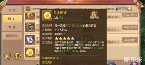 如果小伙伴是队长的话,点开游戏主界面上方的【活动】,在【限时分类】中,点击赏金追妖旁边的参加按钮。
