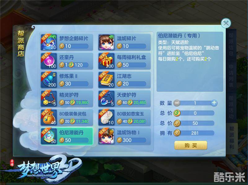 全新宠物“温妮”可爱登场,别看温妮外貌俏皮呆萌,她可是个厉害的法系输出哦!想要获得温妮的少侠们,可以通过“帮派商店”购买温妮的碎片进行召唤。帮派商店除了温妮碎片之外,还有伯尼潜能丹和温妮饰物。通过使用伯尼潜能丹,可以将温妮的天赋技能“跳动音符”进阶至“伯尼伯尼”。