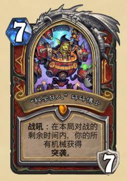 战士英雄,7费7甲,战吼,剩余时间内所有机械获得突袭。英雄技能为2费5种,每回合随机一种,且一定会改变。分别为:1.召唤3个1/1小机器人,绝逼机械。2.造成3点伤害。3.获得7点护甲。4.对所有敌方角色造成1点伤害。5.发现一个机械。不得不说这张卡很强,且不说护甲比其他英雄卡都高,单说这技能就一个比一个厉害。但也并非完美,缺点是只适合机械战,不然战吼发挥不出作用,并且因为英雄技能随机换,所以基本不要指望英雄技能解场,因为你根本控制不了他的变化。