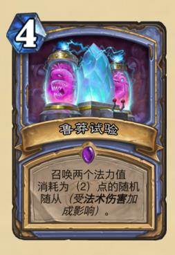 法师4费法术,召唤2个2费随机随从,吃法强BUFF,即有1法强就变成2个3费。这个就非常厉害了,每一点法强相当于赚2费,个人以为这张卡仅仅适合节奏法,配合血法使用或者4费召唤2个随从站场,毕竟有法强赚,没法强不亏,偶尔还能拿到米尔豪斯这种超模生物,总体上还是不错的。除非你能叫个末日,那么算你吊。