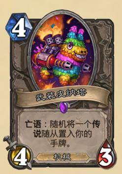 中立,4费4/3机械,亡语将一张随机传说随从加入手牌。站场身材亏了1费,而亡语也只是补一张随机传说随从(不包括法术),稳定性太差,给的传说能不能用不说,场面亏的节奏要怎么挽回才是最大的问题。除非配合鲁莽实验者1费入场,做任务同时还1费刷一张传说,那才可以勉强接受,否则真心没卵用,仅仅是好玩而已。
