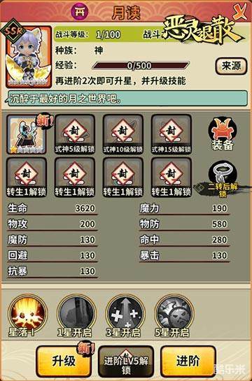 或许是处于对错杀保食神的愧疚,相比于输出,月读的技能更注重助攻。主动技能“星落”能够对范围内3个敌人造成100%的伤害,并降低所有敌人防御20%;被动技能“月灵祝福”在攻击时,有40%的几率增强2名受伤最重己方防御10%;“暗影侵蚀”在攻击时,有40%几率降低攻击目标闪避10%;“月神之灵”可以使攻击增加10%,暴击值增加50,并能免疫控制。