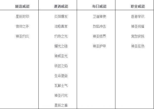 在《无冬Online》中的职业技能采用了DND第四版规则设定,它们被统称为“威能”,并按照技能特性,被划分出几大种类。其中包括随意威能,可以瞬时释放;遭遇威能,通常需要蓄力才能释放;每日威能,则有一击必杀的效果;此外还有提升属性的职业威能,多数属于被动技能。虔诚牧师的通用威能丰富实用,以治疗和辅助为主。