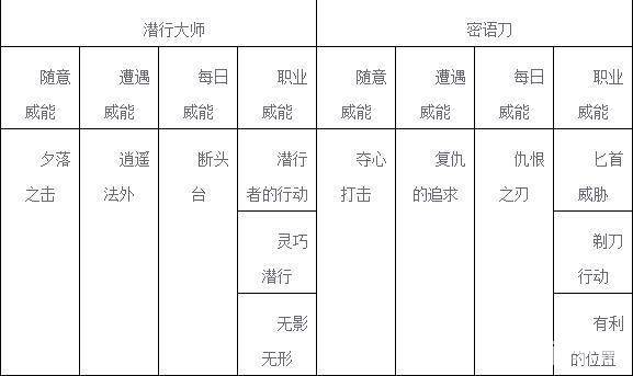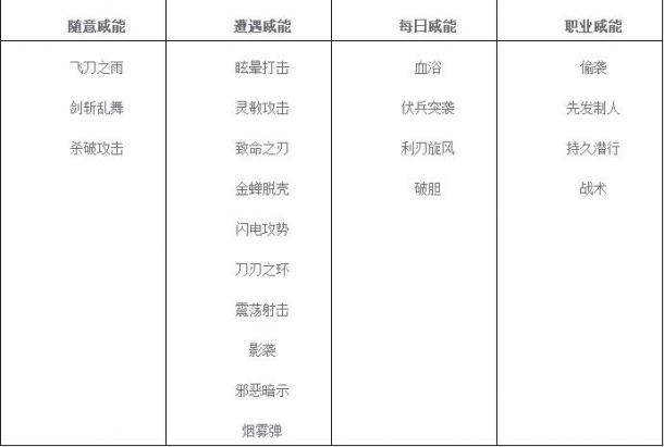 在《无冬Online》中的职业技能采用了DND第四版规则设定,它们被统称为“威能”,并按照技能特性,被划分出几大种类。其中包括随意威能,可以瞬时释放;遭遇威能,通常需要蓄力才能释放;每日威能,则有一击必杀的效果;此外还有提升属性的职业威能,多数属于被动技能。诡术刺客的通用威能非常多样,以暴击和潜行为主。