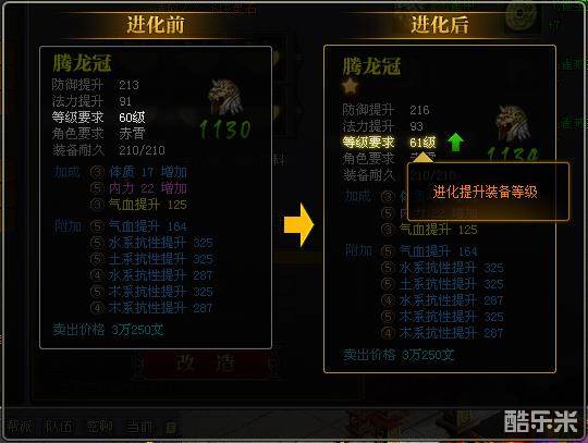 每进行1次装备进化可以使装备的等级+1,同时也可以弱弱地增加一些基础属性。不过装备进化最大的好处是可以让侠米一直只用一套装备。(例如,59级的装备进化之后就变成60的装备了,装备的外观和属性都会有大幅度的提升哦~)