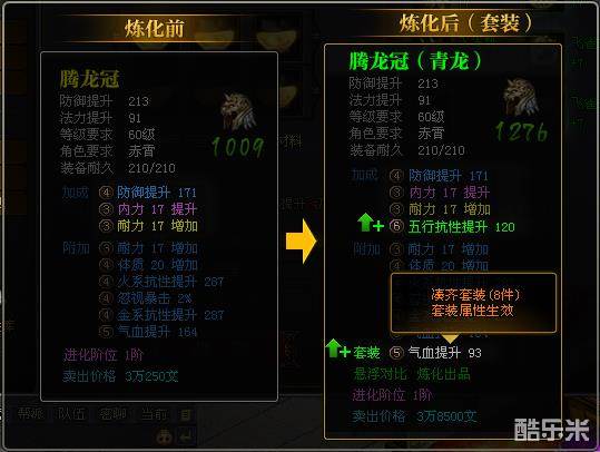 当侠米的装备到达60级后,就可以炼化套装(装备的改造和进化操作要继续保持)了,套装炼化可额外激活 两条属性,一条是绿装加成属性,另一条是隐藏的(凑齐8件套装后,才会激活)套装属性。