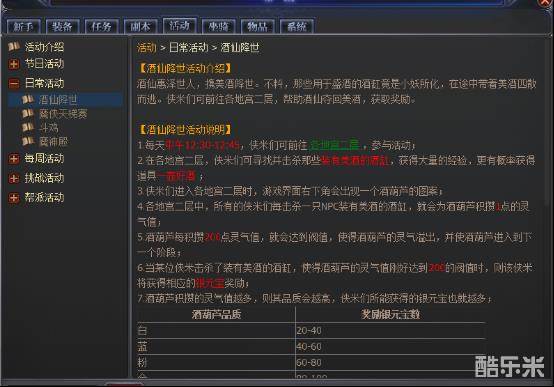 第二个则是每天中午一次的酒仙降世,玩家每天中午都有一次参加的机会。前往跟自己等级对应的地图去打破酒缸,必定会获得一些经验奖励,概率获得银元宝的奖励。而且酒缸碎了也会掉落一些酒壶,当活动结束后前往洛阳王那里,玩家就知道如何使用酒壶了。