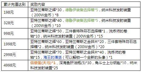 活动内容:活动期间,玩家在游戏内累计充值达到活动条件,即可领取对应数量的海王进化道具-亚特兰蒂斯之辉。