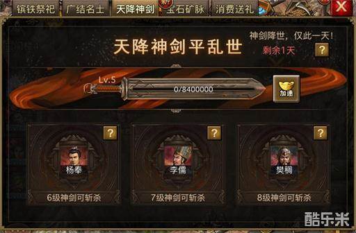 神剑介绍:神剑初始等级为1级,最高可升到13级。每升1级可以斩杀一个NPC(共12个),斩杀后可获得奖励。