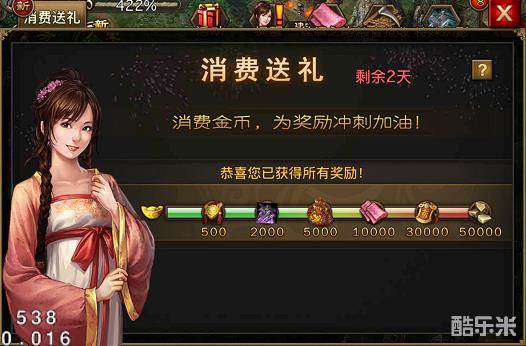 活动内容:活动期间内,玩家金币消费累计达到以下要求,即可获得相应档次的奖励。消耗越多,送的越多!