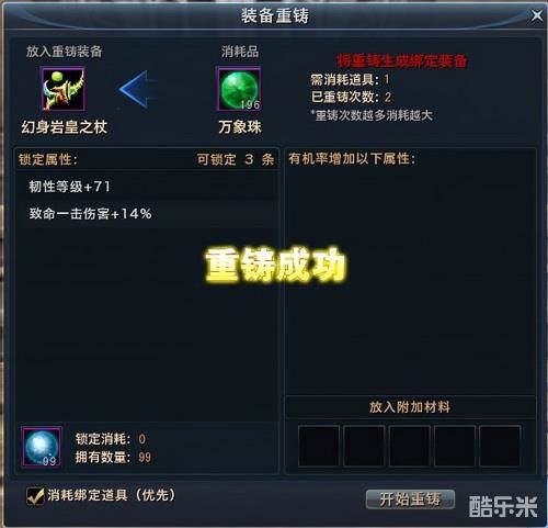 每次“重铸”将随机改变装备的现有“随机属性”。属性的随机空间,则视“开锋等级”越高,而随机出更高值的几率越大。属性的随机条数,则根据装备“冲锁”而定,“冲锁”冲开的条数越多,可随机出的属性条目越多。