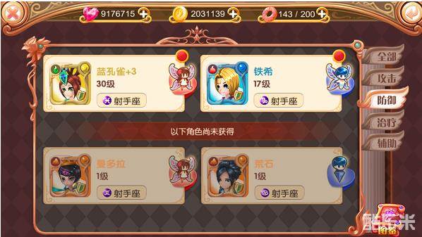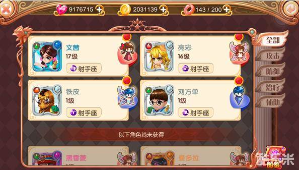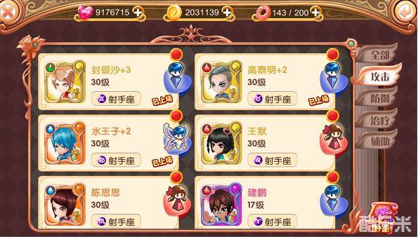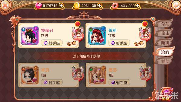 通过界面右侧标签可知,叶罗丽手游根据四种职业定位对角色们进行了分类,分别是攻击、防御、治疗、辅助。