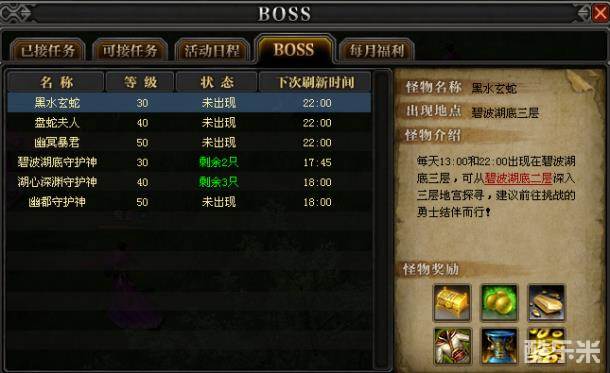 只要有实力,只要你肯努力,那么终极赚钱方式就属于你了。点击游戏右上角的“今日指引”,再点击“BOSS”标签。即可看到各个守护神和世界BOSS的状况。
