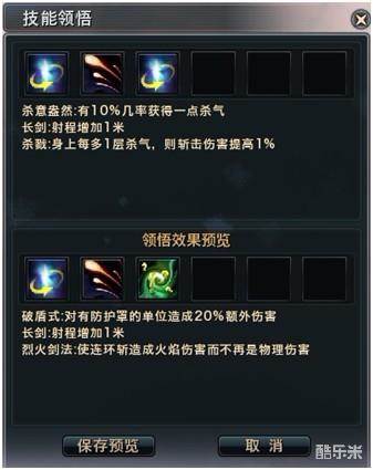 点击“开始领悟”按钮就会进行技能领悟了。在技能领悟界面,您可以看到领悟效果的预览,如果是您满意的效果,您可以点击“保存预览”对领悟结果进行保存,“取消”将不会对结果做出保存。注意,若您曾进行过这个技能的领悟,那么保存后新的领悟会完全替换掉之前的领悟效果。
