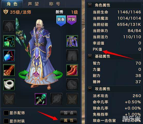 您可以使用快捷键C打开自己的玩家面板,点击“属性”来查看自己的PK值。