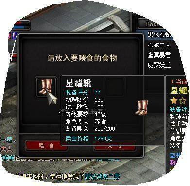 至于50级物品喂养BOSS我就不介绍了。现在即将更换50级装备,没人舍得把50级的装备喂了BOSS吧!!!