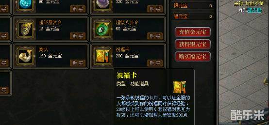 祝福卡,土豪专属聊天。而且在使用的时候整个服务器的玩家都会受到一定的经验奖励,专用于土豪快要升级的时候又没有合适的经验来源,通常一批祝福卡就可以搞定升级了。