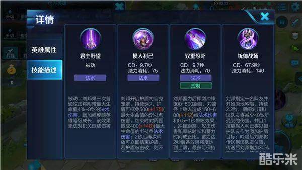 大招-统御战场:刘邦指定一名队友开始吟唱,吟唱期间该名队友和刘邦会获得高额免伤效果,并且还会为援助的队友套上自身一技能的护盾;吟唱结束后刘邦传送至该队友身旁,短暂提高自身移速的同时还,还会生成一片跟随移动的、提供双抗的力场。