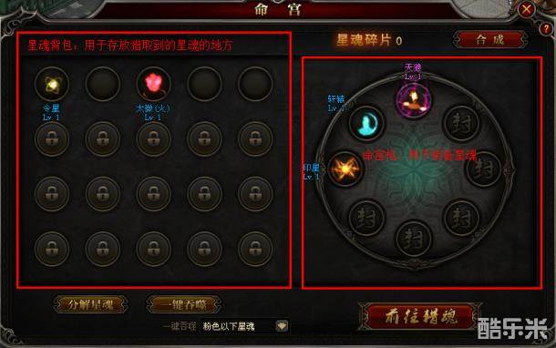 此界面主要作为星魂的展示界面,界面主要有星魂背包区域(用来存放已经获取到的星魂)和命宫格区域(用来装备星魂),同时这个界面里面还有分解星魂和一键吞噬等功能按键,下面会给大家做个介绍: