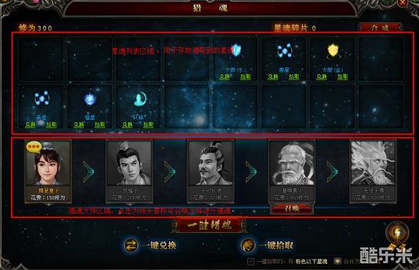 这个界面主要是用来获取星魂,界面主要有星魂列表区域(用来展示猎取到的星魂)和猎魂大师区域(点击猎魂大师来进行猎魂),此外还包含一键猎魂、一键兑换、一键拾取、召唤等功能,接下来对各个功能给大家做个简介: