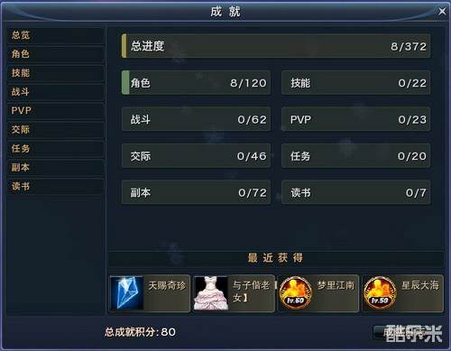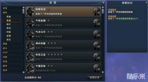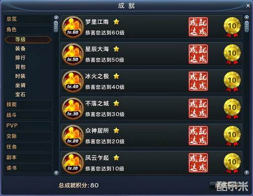 成就目前分为四类:角色成长,综合、PVP和任务。