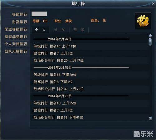 排行榜界面的首页为“我的排行”。在这里您可以看到自己的角色名称、职业等级、帮派和自己在排行榜上的变化。除了查看自己的信息,您还可以通过切换到“好友”或者”帮派”来查看大家在游戏中的各种变化。