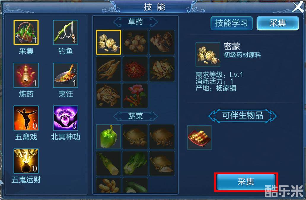 采集流程:点击采集图标,在中间物品框中选择要采集的对象,点击采集按钮后可自动寻路到采集地点。