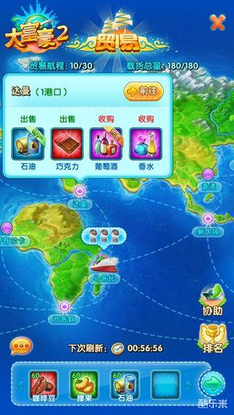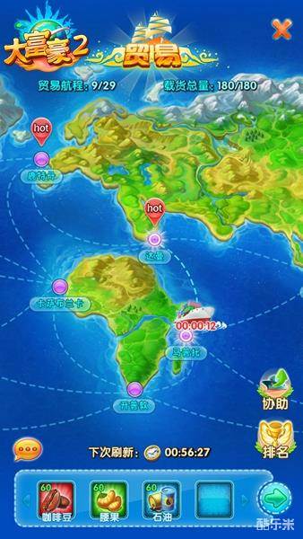 贸易是《大富豪2》内的一个趣味玩法,也是C币的重要产出地。“贸易”范围覆盖了五大洋四大洲的27个国家。玩家可以通过地图版面查看每个国家供求关系,派出货船从低价国家买入然后卖给高价收购的国家,足不出户,享受主宰全球贸易的畅快,还能赚得大量资金!