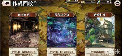 在游戏中通关作战回收玩家们可以获得强化装备使用的材料,难度越高获得的数量也就越多。其中碎玉矿坑提供的是头盔和衣服的强化材料,哥布林之森提供的是手套和鞋子的强化材料,边境村庄则是提供饰品的强化材料。