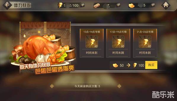 体力可每天购买五次,而在相应的时间段可以免费领取体力,所以记得登录游戏领取体力哟!