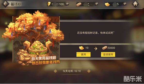 摇钱树每天可使用10次,而使用元宝购买的时候有一定几率会出现暴击,暴击可获得更多的金币!