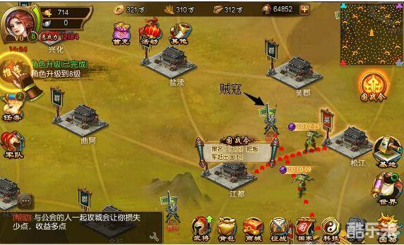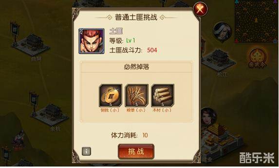 进入世界地图,散布在城池之间的人就是暴民或者贼寇了!点击就可以查看该暴民\贼寇的等级、战斗情况,以及成功围剿后可以获得的物品报酬。