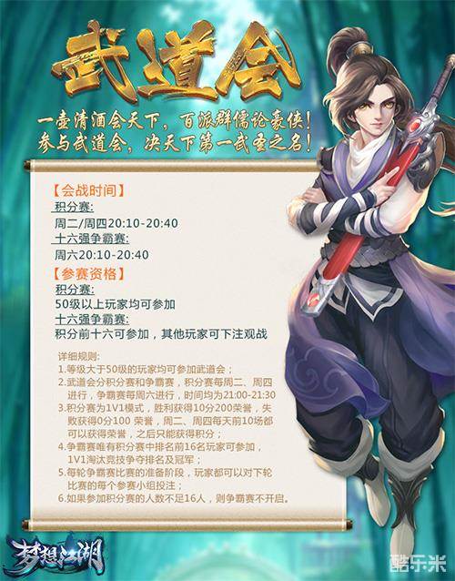 每届武道会有三场比赛,周二、周四21:00-21:30进行积分赛,积分前十六的玩家入选周六21:00-21:30的争霸赛,逐级淘汰,战到最后,方可获得至尊“武圣”的称号。