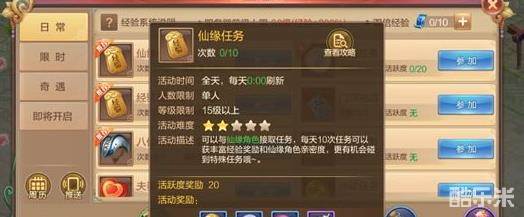 首先,在【活动】界面里,我们可以看到仙缘任务里的任务介绍: