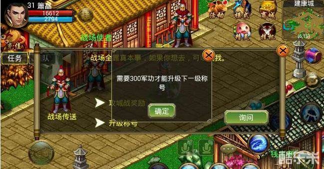 军功 可在各大主城的战场传送(NPC)升级称号(如图),当军功达到300点时,即可开始兑换属于你的第一个军功称号。兑换称号所需要的军功每级+300点。