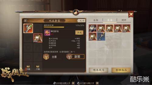 等级达到71级的将军即可开启“双生套装”系统,副套装备栏可以装备第二套装备,随着将军等级的提升将不断解锁副套装备栏,主套装备和副套装备携带的套装效果不能同时生效,可以通过选择主套或者副套按钮,自由切换需要的套装效果。