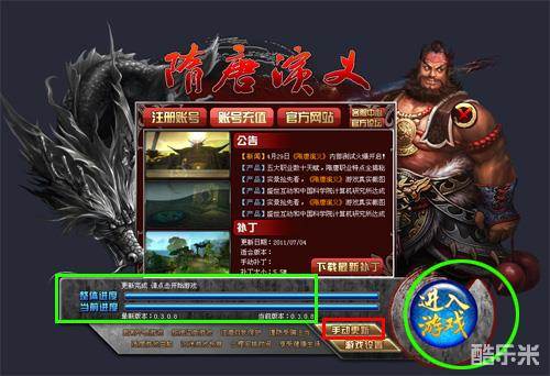 第一步,双击桌面图标,就可以看到以下的登录器界面,一般采用默认的游戏系统设置即可正常进行游戏。如游戏有补丁需要更新,登录器会自动进行更新[绿框],如无法自动更新,请点击[红框]处的“手动补丁”按钮下载手动补丁进行更新。当游戏更新完毕后,便可点击[绿圈]处的“进入游戏”按钮。