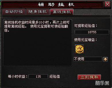 当玩家达到10级之后便可使用离线挂机功能,玩家每次下线后会根据玩家离线的时间(最多10小时)给玩家奖励经验,玩家下次上线后点开挂机界面可提取离线经验,同时玩家可使用元宝使可提取经验翻倍。