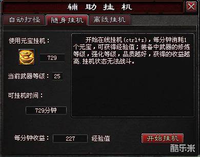 当玩家达到20级后便可使用随身挂机(Ctrl+Z)功能,开启随身挂机每分钟消耗1元宝,同时可获得可观的经验值。玩家手中的武器等级越高品质越好,每分钟可获得的经验就越多。玩家在挂机状态下无法进行战斗