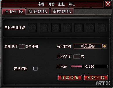 当玩家达到40级后便可使用自动打怪的功能,开启自动打怪(Alt+Z)允许玩家在不需操作的情况下自动攻击周围的怪物。自动打怪允许玩家设置自动使用技能,自动使用血瓶等功能。开启自动打怪需消耗元气值