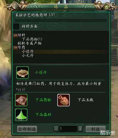 5、小还丹为可用炼制的最低等级的丹药,炼制小还丹,需要下品药粉、下品玉瓶和下品晶砂,如下图所示: