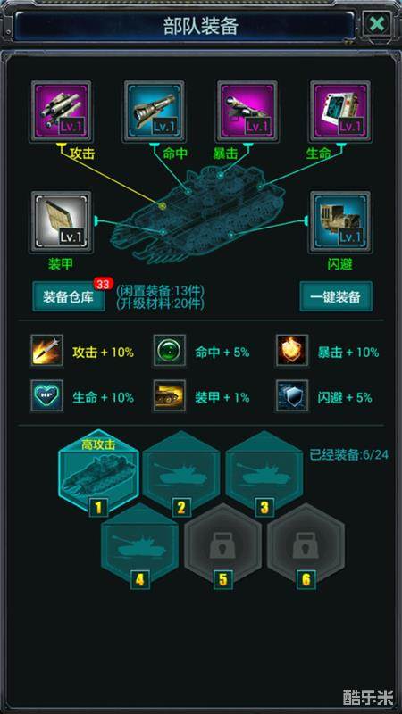 装备属性:装备可穿戴到部队格子上,每个格子可穿戴6种不同属性的装备。