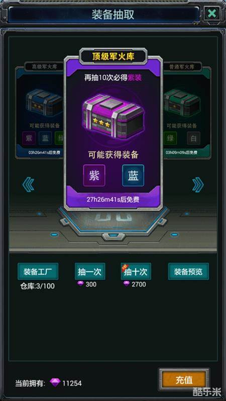 可以从普通军火库,高级军火库,顶级军火库,进行装备抽取。每个军火库中均有免费抽取的机会。