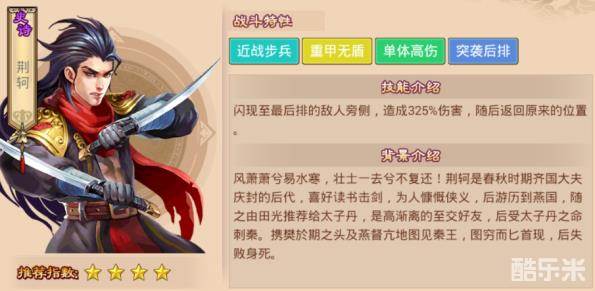 荆轲的速度极快,并且爆发伤害完全能一击秒杀大多数将领,并且能完美脱身(比历史上的荆轲牛逼多了),秒杀后排输出的最佳人选。