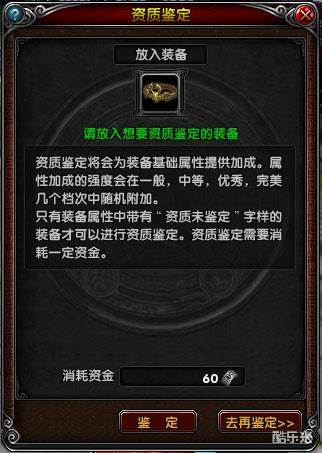 资质鉴定可以额外提高装备的基础属性。只有属性中有“资质未鉴定”字样的装备能进行资质鉴定。鉴定出资质分为一般、中等、优秀、完美4个档次,每个档次都有一定的属性加成范围,鉴定师将在个个范围中随机赋予装备额外的属性加成。