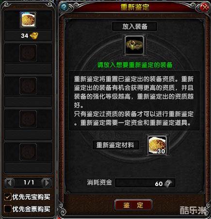 重新鉴定可以充值装备的资质鉴定属性。只有“资质鉴定”过的装备能进行重新鉴定。重新鉴定有几率鉴定出比完美资质更强大的无暇资质。