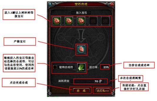 打开宝石合成界面一次右键点击或拖动同类同等级的宝石至宝石放置处,可勾选使用合成材料以提高25%的合成成功率。点击合成按钮完成宝石合成。