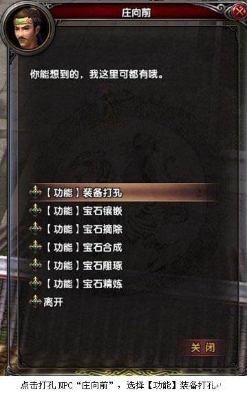 装备打孔NPC在王城叫“庄向前”,(坐标:178,363);或者点开随身宝石强化界面,点击进行打孔。