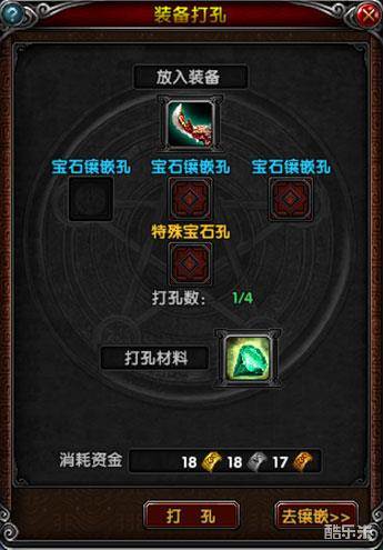 装备打孔可以为装备增加用于镶嵌宝石的孔。每件装备均可以打3个普通孔和1个特殊孔。特殊宝石孔需要用破天石开启