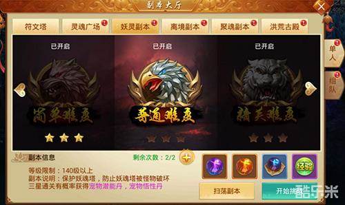 保护妖魂塔,防止它受到怪物的破坏是每一名仙友的责任,因此“妖灵副本”也被定义为守护型副本,每天玩家可免费进入2次,当然,如果是身为贵族的仙友还可增加额外进入次数。玩家在副本中需要在有限时间内击退5波穷凶极恶的妖怪才算挑战成功,小编友情提示,若没有一夫当关万夫莫开的实力,可千万要小心,危险指数三颗星~